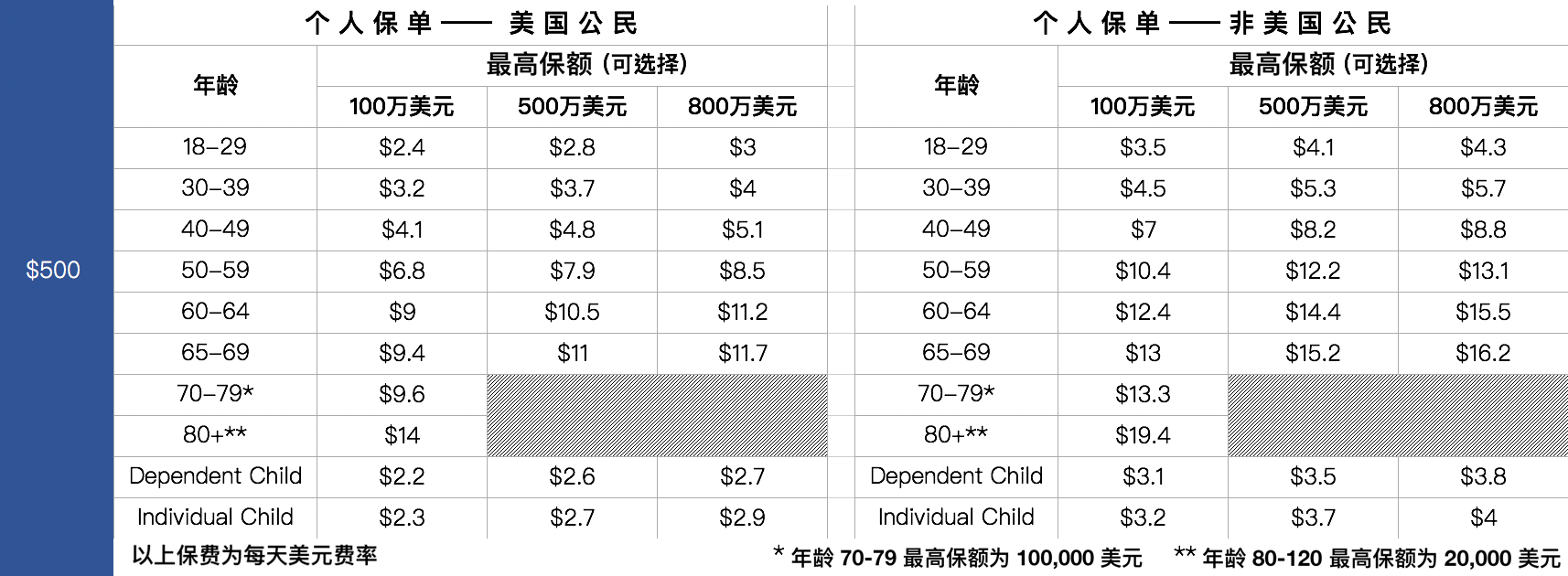 • 最高保额:$ 1,000,000 至 $ 8,000,000 不等